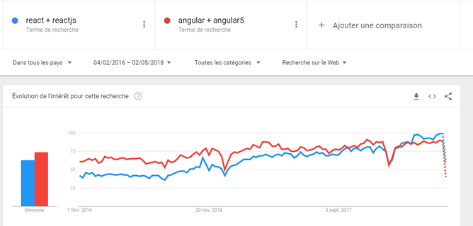 A l’heure où j’écris ces lignes, Angular 5 vient d’être annoncé cinq mois auparavant avec un ensemble de mises à jour très intéressantes qui ont boosté les performances du framework comme l’ajout de Enhanced RxJS (observables), Build Optimizer, améliorations du compilateur, remplacement du ReflectiveInjector par StaticInjector, exportAs, client HTTP… Pour en savoir plus sur ces fonctionnalités, vous pouvez consulter mon article Angular 5. Cependant, React.js reste jusqu’à présent l’une des principales bibliothèques concurrentes d’Angular. Personne ne peut nier la taille de la communauté React et combien sont amoureux de la technologie les gens qui la composent.